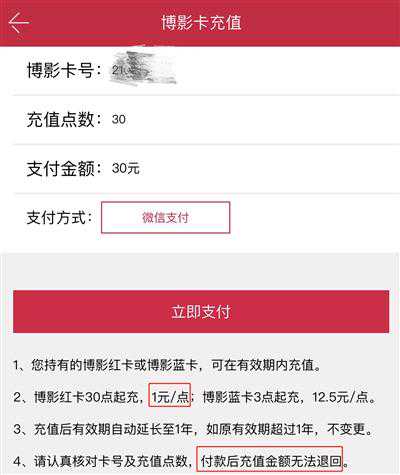 “博影”客服人员介绍,剩余点数不会退费。像胡先生这样剩余12个点,可以在线上兑换电影票,线上补差价。抵扣12个点以后,剩余微信支付。此外没有别的选择。个人充值1元/点,红卡30点起充。补差价这种方式,差多少补多少,能保证把卡内余额用完,相对划算。
