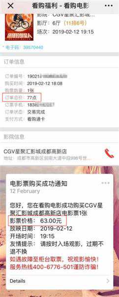 近日,拥有一张“看购电影”会员卡的成都市民彭小姐想去影院看一场热门国产电影。当天18时许,她通过“看购电影”微信公众号“看购福利”购买了一张19:15开场的电影票,观影地点是CGV星聚汇影城成都高新店。当微信收到“电影票购买成功通知”时,她看到,影票价格为63元。而订单信息显示,订单总价为77点。“63元77点?”她脑中闪过一串问号。