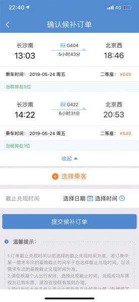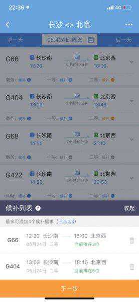 如果您发现最理想的车次已售罄,可以选择相邻两个乘车日期的不同车次,可添加4个候补需求,每个候补订单最多可添加3个乘车人,但值得注意的是,多人出行时,可能分配到不同车厢。与此同时,系统还会显示出候补购票需求列表,并显示每个候补需求的当前排位。