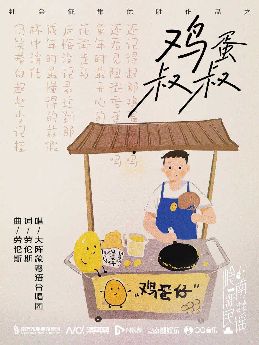 《鸡蛋叔叔》创作取材自真实故事,词曲作者劳伦斯无意间得知幼时学校旁一位卖鸡蛋仔的叔叔已去世,触景生情,写下了这首歌。“鸡蛋叔叔”陪伴了几代人成长,是一种回忆,很岭南,很乡愁,也很有共鸣。一年前,劳伦斯和制作人晴朗等一起成立了“大阵象粤语合唱团”,致力粤语文化和粤语歌曲的创作和推广,《鸡蛋叔叔》就是这段时间不断打磨出来的作品。劳伦斯说在“鸡蛋叔叔”的年代,鸡蛋仔每天的味道都不一样,所以想留住这种味道,留住童年时的简单纯真。