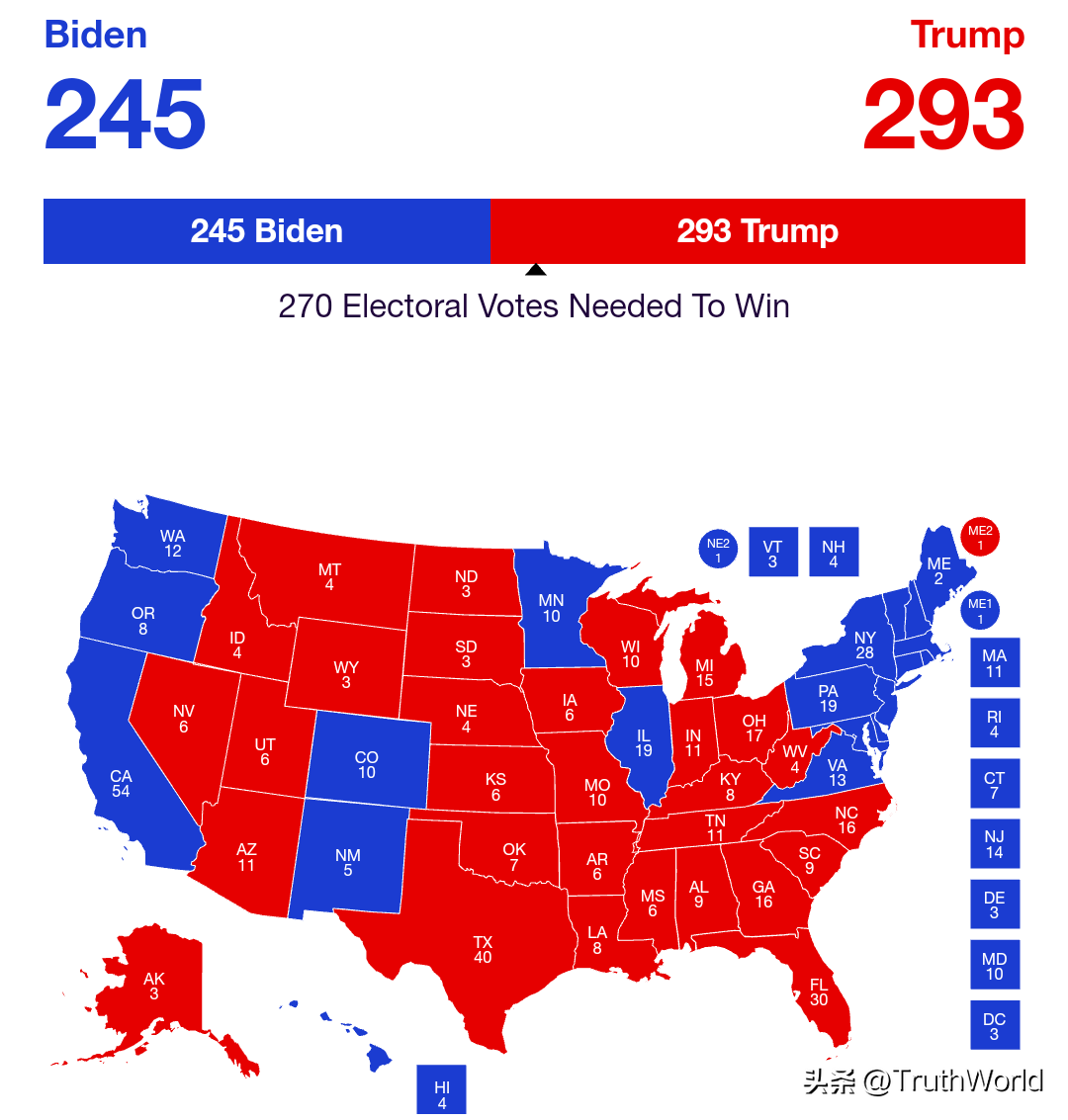 其中,特朗普的选举人团票有所下降,相比于上次的312张选举人团票,这次特朗普仅获得了293张选举人团票,而他的竞争对手拜登则获得了245张选举人票——特朗普仅领先拜登48张选举人团票。