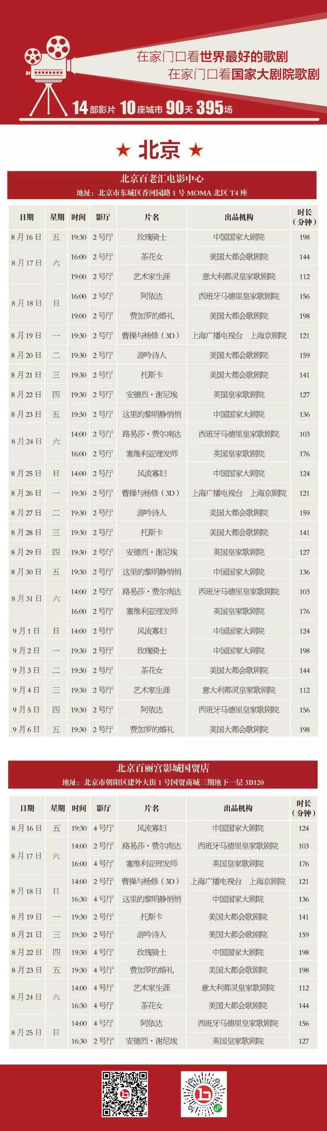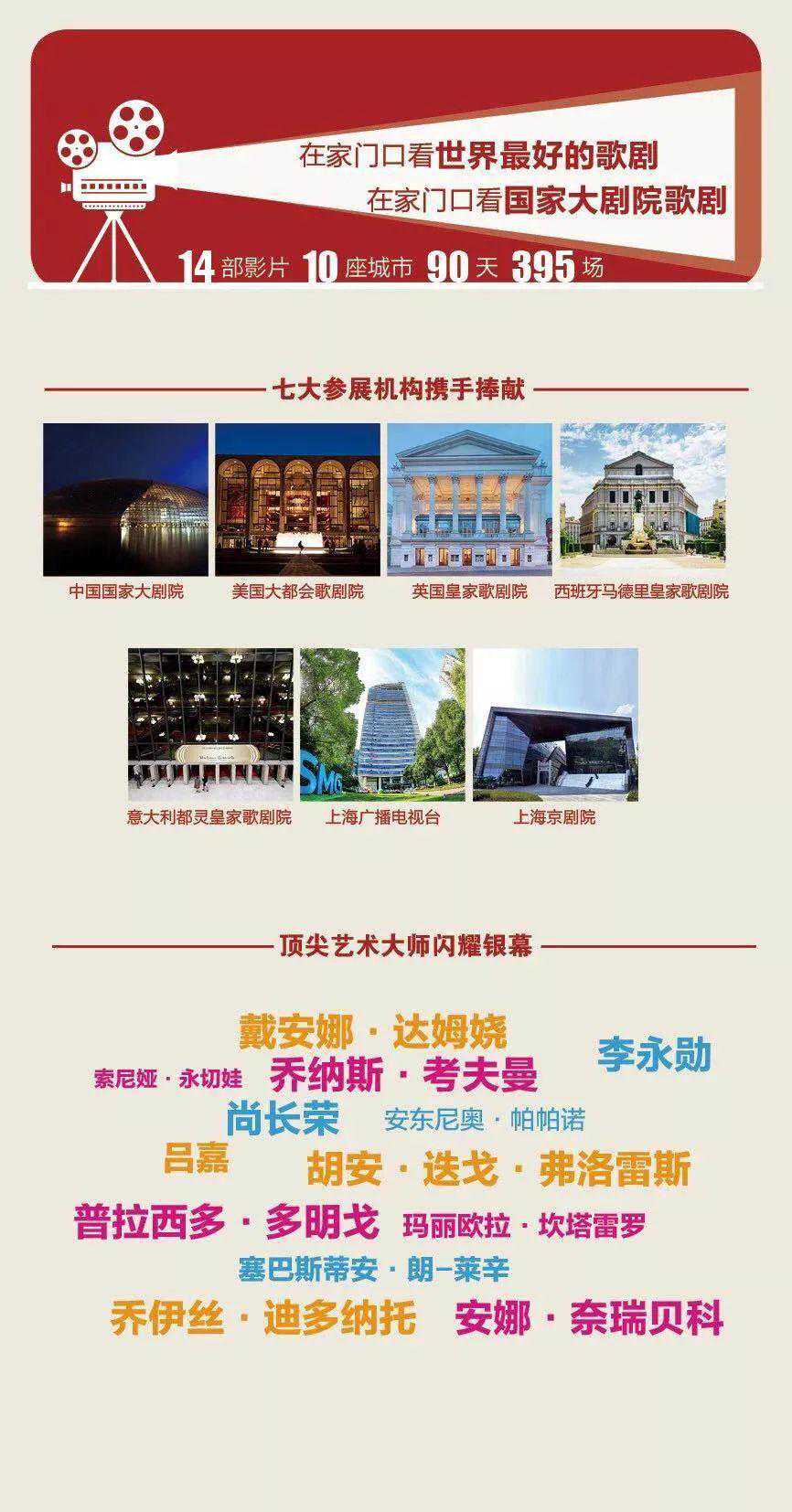 从8月3日起到10月31日,北京、成都、大连、杭州、无锡、上海、昆明、武汉、深圳、广州全国10大城市、22家影院的黄金时段将陆续开始展映歌剧电影近400场。