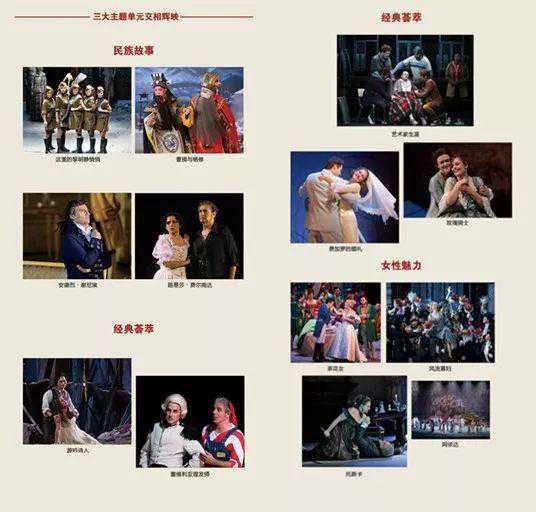 参展影片共分为三大主题单元:民族故事(《长征》《这里的黎明静悄悄》《曹操与杨修》《安德烈·谢尼埃》《路易莎·费尔南达》)经典荟萃(《费加罗的婚礼》《玫瑰骑士》《艺术家生涯》《塞维利亚理发师》《游吟诗人》)女性魅力(《风流寡妇》《茶花女》《托斯卡》《阿依达》)。