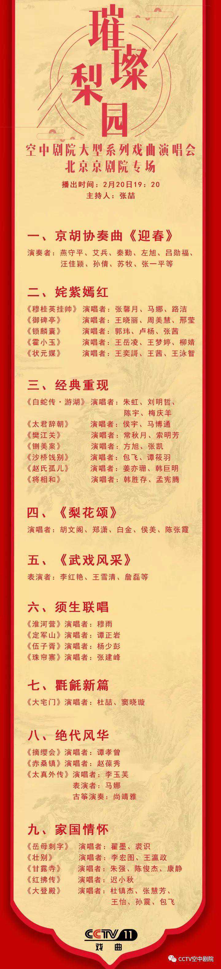 接着演唱会以姹紫嫣红、经典重现、梨花颂、武戏风采、须生联唱、氍毹新篇、绝代芳华、家国情怀几个段落构成,来自北京京剧院的老中青三代演员将为您献上精彩节目。