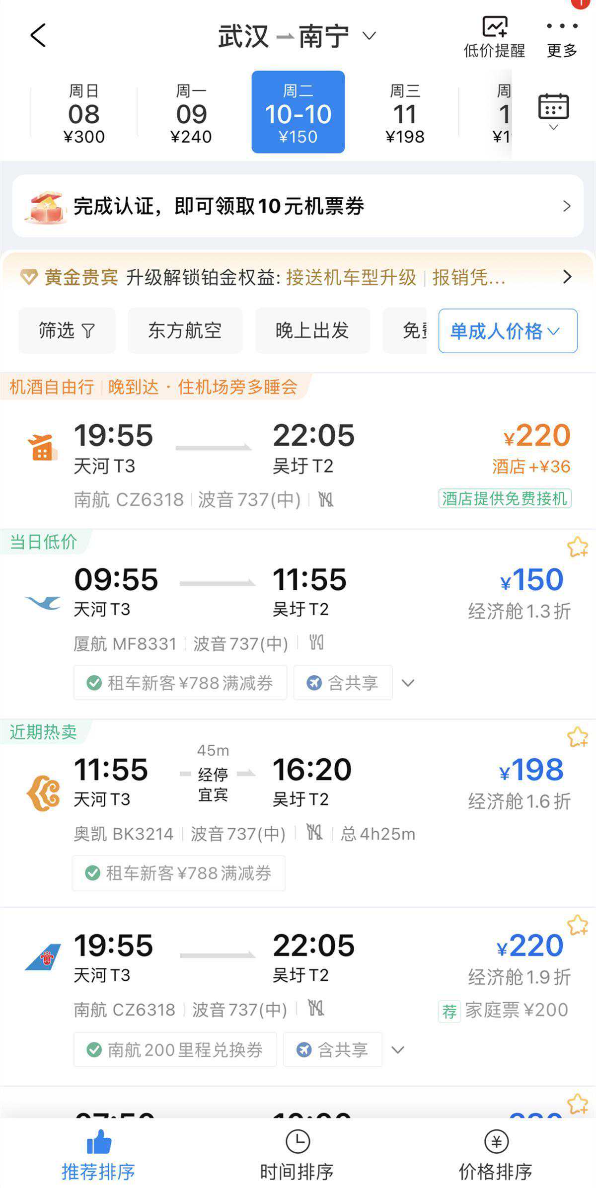 极目新闻记者梳理发现,假期过后,部分航线的机票票价比火车票价还便宜。以武汉至南宁为例,乘坐高铁二等座的票价为486元,耗时7小时左右,并且高铁票价高于节后最低航班票价的150元。武汉至成都的复兴号高铁票价为643元,耗时7个小时左右,而飞往成都的航班最低票价为280元。