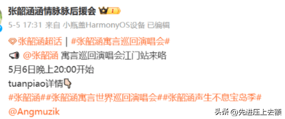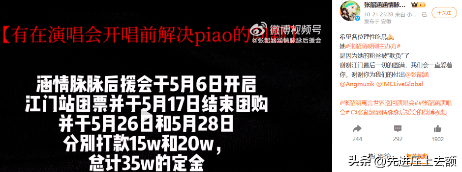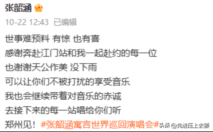 10月21日,张韶涵开始在江门唱歌。说话间,他突然向粉丝道歉,并承诺按照自己的了解,帮助粉丝“战斗”。