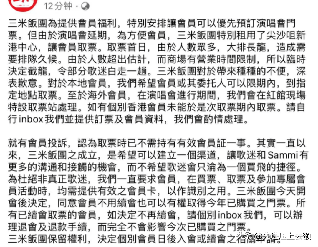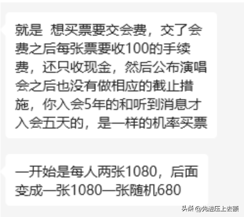 他指责歌迷会犯下N罪:提前宣布“摊位关闭”的取票时间。要获得门票,您必须更新会员资格并支付100元手续费。如果不续订,则无法获得门票。
