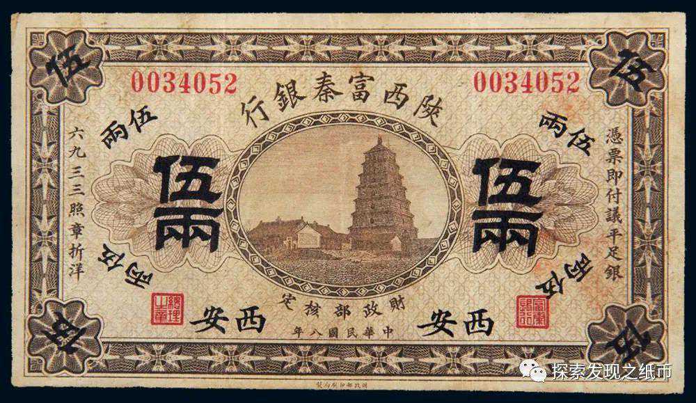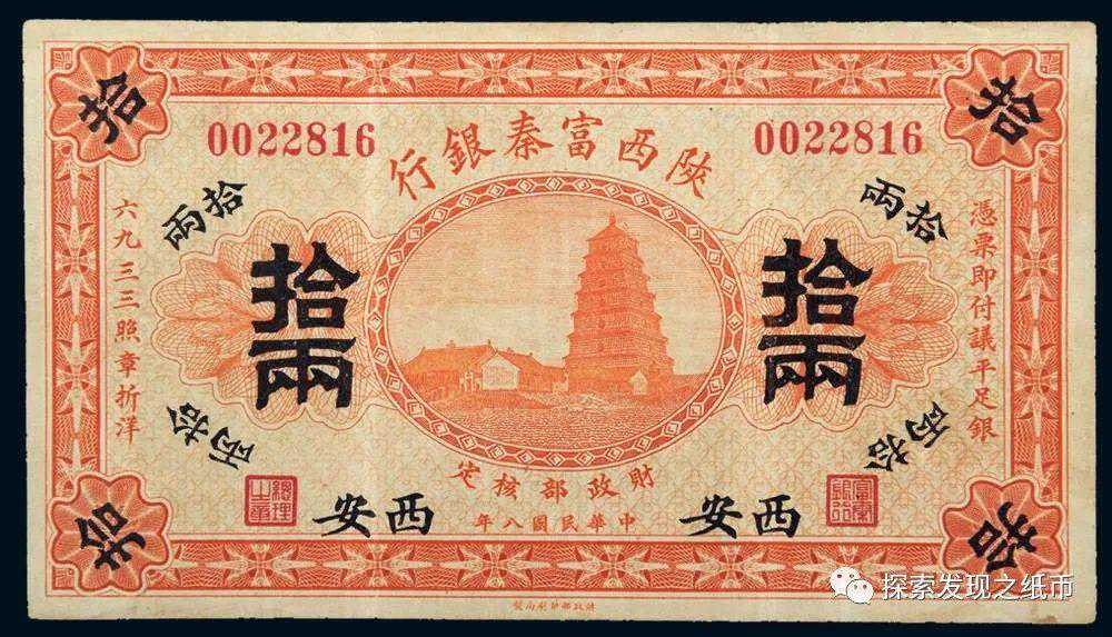民国6年,陕西秦丰银行改名为陕西富秦银行,随后又将富秦钱局划归该行管辖。按照财政部规定,富秦银行可以发行兑换券,仍以富秦钱局所发数额为限。民国8年该行发行银两票有壹两、贰两、叁两、伍两、拾两共五种,另见有伍拾两剪角票世存,截止10年底发行银票达240万两。民国10年曾一度停兑,11年复业后又发行银元券,分壹圆、伍圆和拾圆,按照1:1将以前所发银票收回。直到民国15年西安城解围之后,它所发的银两票才收兑完毕,该行宣告结束。