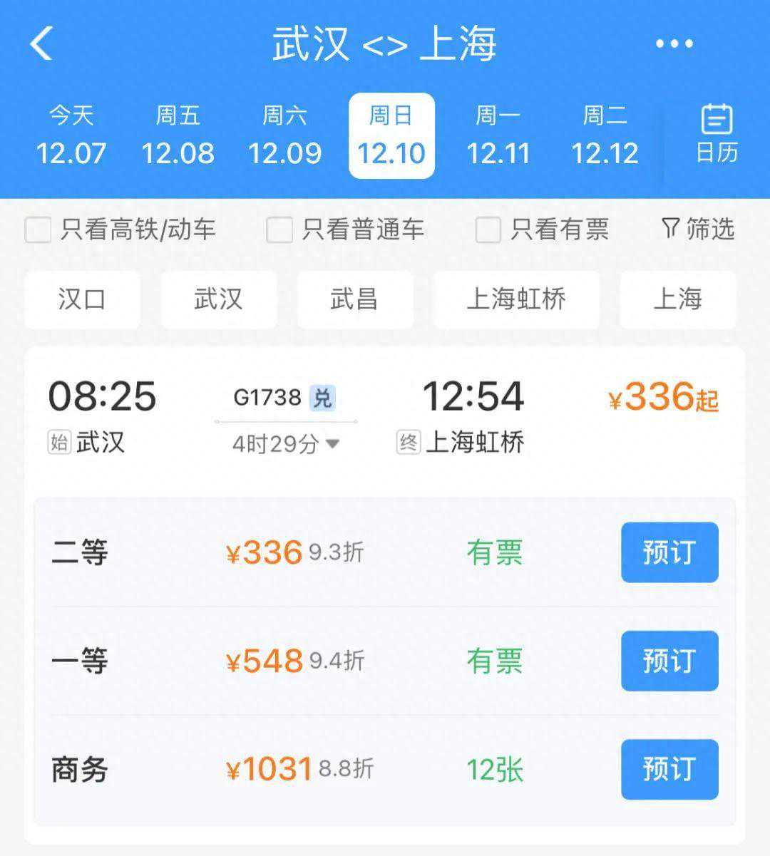 改版后的12306APP购票页面