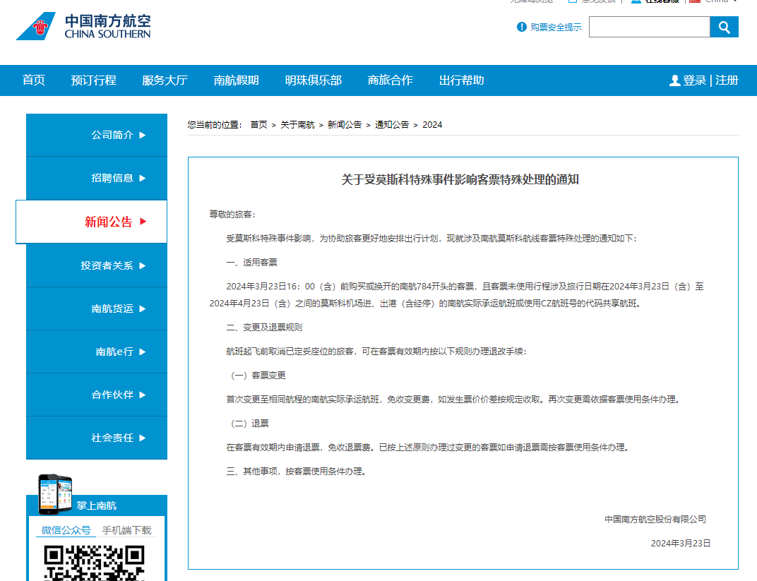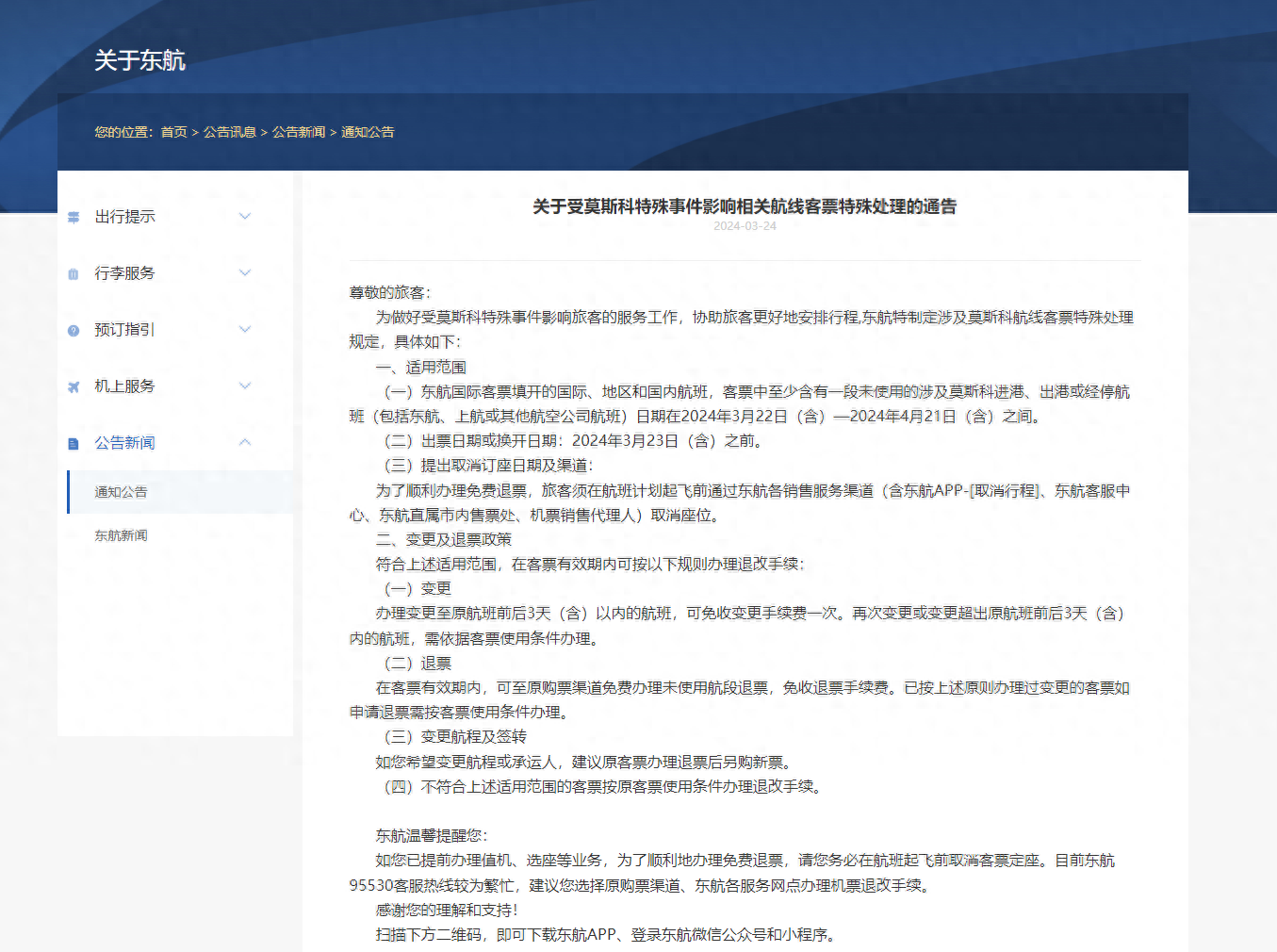 现代快报记者了解到,受此次事件影响,国内多家航空公司陆续发布涉俄罗斯航线客票特殊处置方案,以便协助旅客更好地安排出行计划。比如:东航是涉及莫斯科进港、出港或经停航班(包括东航、上航或其他航空公司航班),日期在2024年3月22日(含)—2024年4月21日(含)之间的,在客票有效期内,可至原购票渠道免费办理未使用航段退票,免收退票手续费。办理变更至原航班前后3天(含)以内的航班,可免收变更手续费一次。