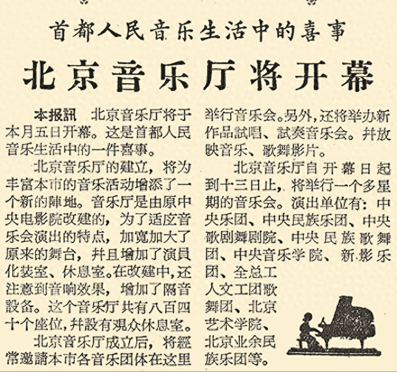 据本报1961年8月1日2版《北京音乐厅将开幕》报道,为了适应音乐会演出的特点,音乐厅加宽加大了原来影院的舞台,并且增加了演员化妆室、休息室。在改建中,还注意到音响效果,增加了隔音设备。这个音乐厅共有840个座位,并设有观众休息室。自8月5日开幕至13日,这里举行了十场开幕音乐会,令喜爱音乐的市民大饱耳福。