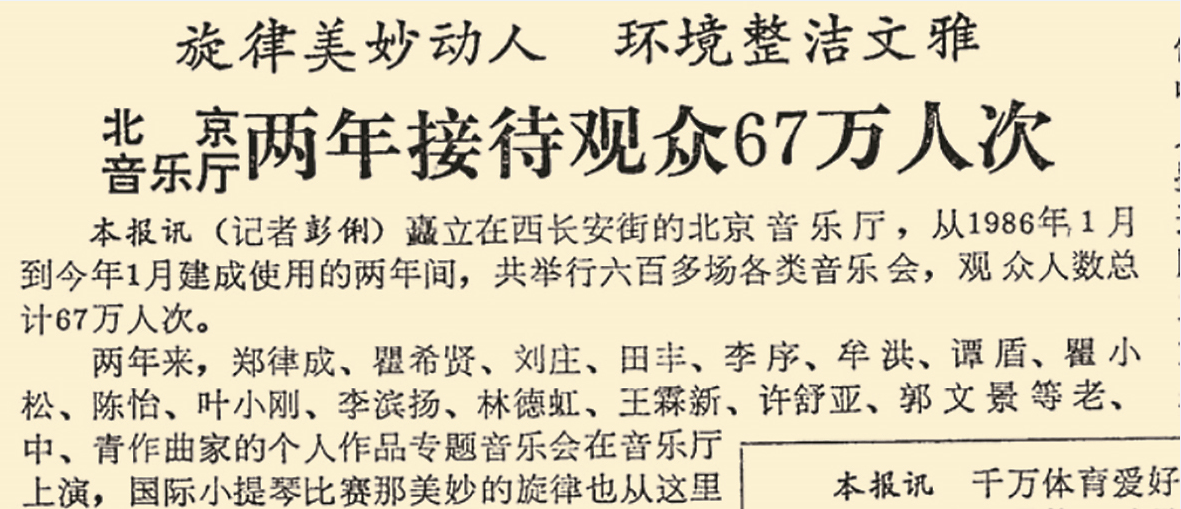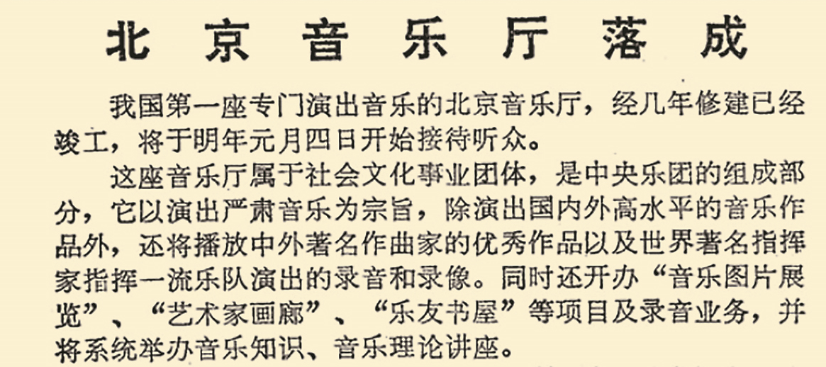 1985年底,一座崭新的北京音乐厅正式落成。它是我国第一座现代模式的音乐厅,可以容纳1182名听众。除演出国内外高水平的音乐作品外,音乐厅还播放中外著名作曲家的优秀作品以及世界著名指挥家指挥一流乐队演出的录音和录像。同时还开办“音乐图片展览”“艺术家画廊”“乐友书屋”等项目及录音业务,并系统举办音乐知识、音乐理论讲座。(1985年12月26日《》2版,《北京音乐厅落成》)