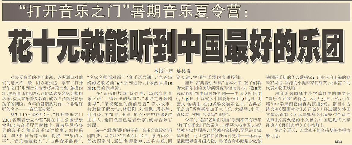 1994年暑期,北京音乐厅为少年儿童举办了音乐普及活动。演出实行低价位,音乐家的现场演奏和精辟的讲解相结合,并与观众亲切互动,受到学生和家长的欢迎。自1998年开始,暑期系列音乐会开始正式启用“打开音乐之门”这一主题,组织者旨在通过“高水准、低价位、现场讲解”的形式,让广大老百姓叩响高雅艺术之门。(2000年7月21日《北京晚报》37版,《10元钱打开音乐之门》)该品牌创立至今已走过二十余年,如今早已不局限于北京音乐厅,而是汇集了越来越多的社会力量,成为首都文艺活动的一张名片。