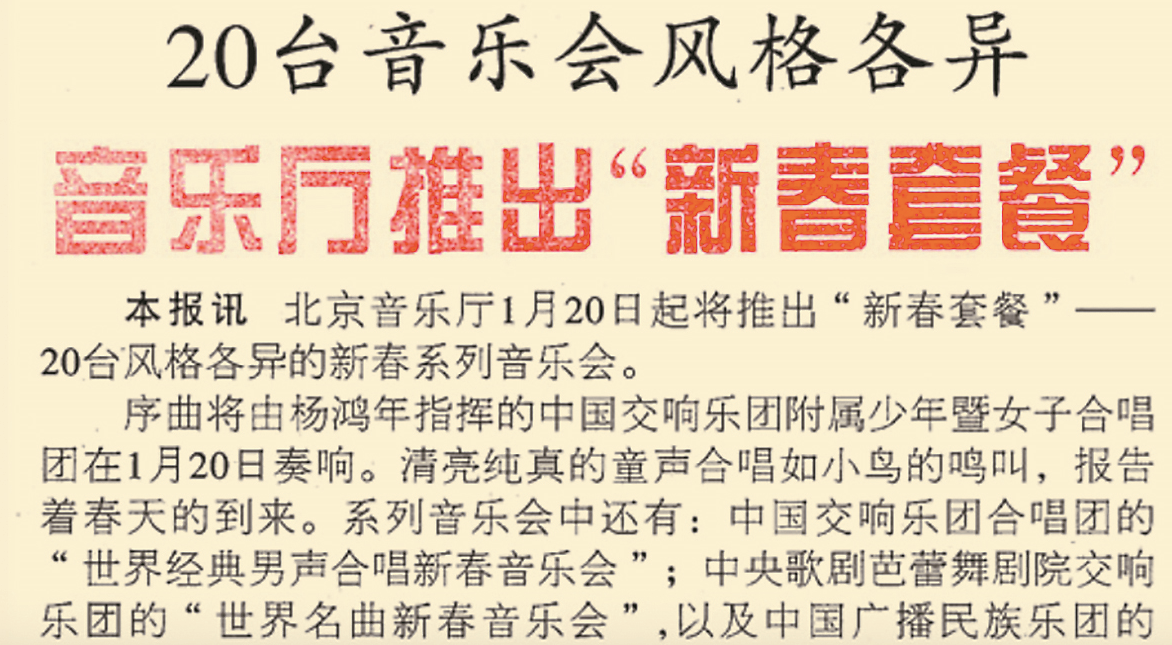 从上世纪90年代中期开始,每年春节,北京音乐厅都会上演丰富多彩的“新春套餐”。在一年一度的新春音乐会上,北京交响乐团、中央民族乐团、总政歌舞团交响乐团等单位都会带来最新创作的、具有中国特色的音乐作品,并邀请国外知名指挥家和演员参加演出。1998年春节,北京音乐厅一口气举办了20台风格各异的音乐会。(1998年1月19日《》5版,《音乐厅推出“新春套餐”》)1999年春节,北京音乐厅隆重举办了为期十天的“中国唐宋名篇音乐朗诵会”。朗诵会在数十位小学生的集体朗诵中拉开帷幕,在交响乐的伴奏声中,孙道临、乔榛、丁建华、濮存昕等著名表演艺术家声情并茂地朗诵了唐宋诗词歌赋中的名篇佳作。十天的演出场场爆满,演出结束后仍有许多观众来电来函要求加演。(1999年2月13日《》4版,《音乐伴着美文传》)