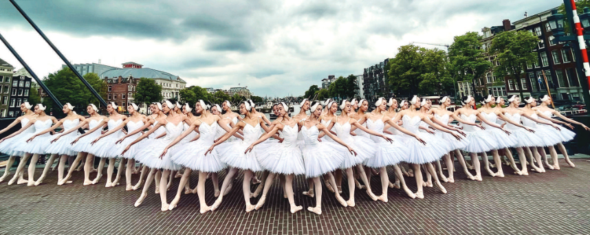 当48只“白天鹅”飞临阿姆斯特丹马格尔桥,意味着上芭经典版《天鹅湖》第四轮欧洲巡演正式开启。(上海芭蕾舞团供图)