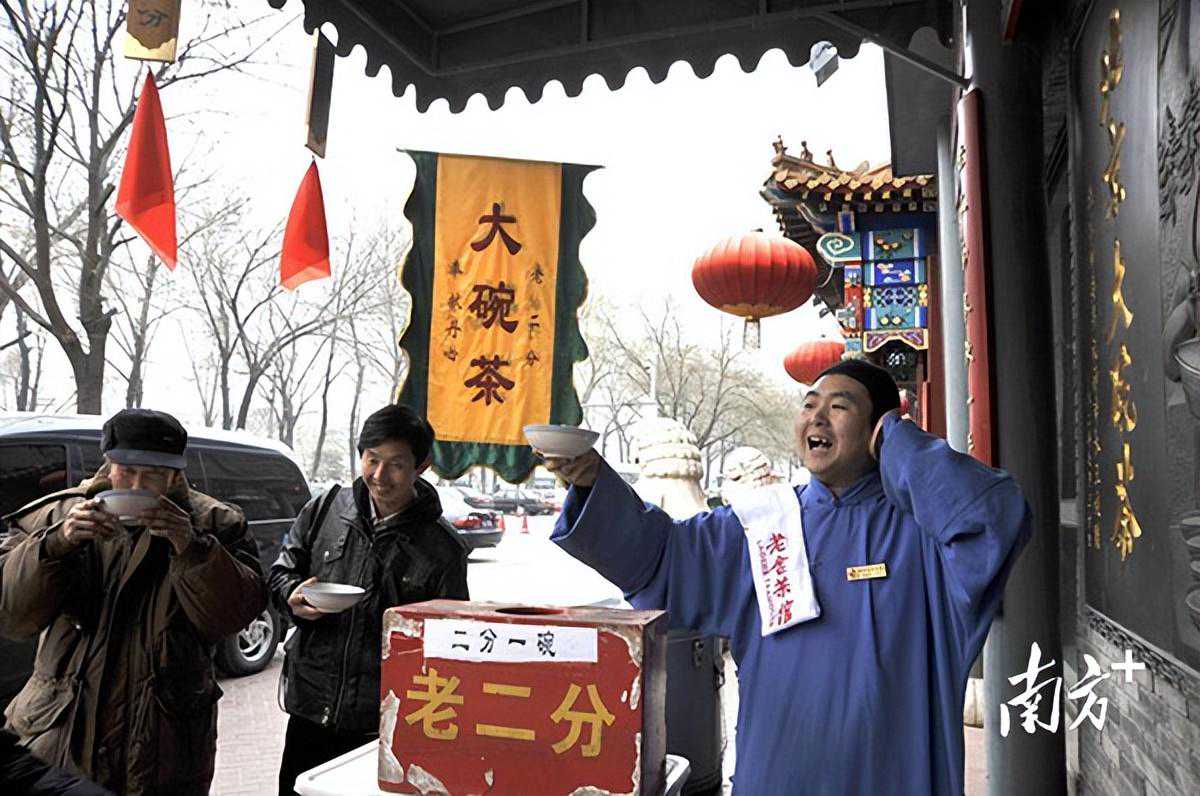 大碗茶是很多人对老北京城的一个独特记忆点,做为一个文化符号,许多中外游客旅行北京,都会慕名来到老舍茶馆,听听当年红遍街头巷尾的《前门情思大碗茶》。这首歌曲,正是著名艺术家阎肃在喝完大碗茶后所作的。于静说,?北京前门老舍茶馆的门前有这样一副对联,“大碗茶广交九州宾客,老二分奉献一片丹心”,这也正是尹盛喜先生当初提出并一直延续的“老二分精神”,也是老舍茶馆多年来一直传承的社会责任意识。“大碗茶摊就在我们门口的雷锋岗,一直持续了四十多年。时至今日,我们仍然保留并传承着老二分钱大碗茶摊的传统。”