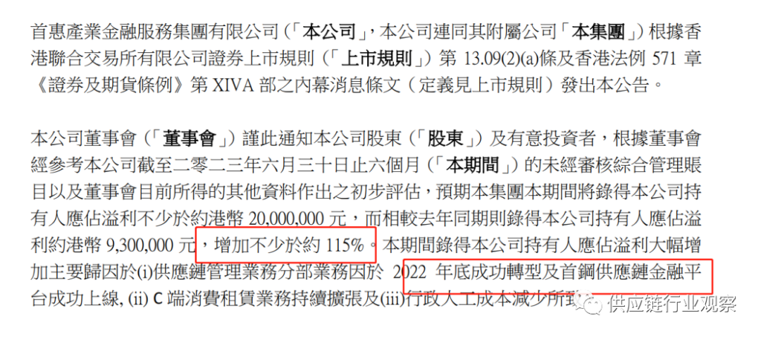 公告信息显示,首惠产融2022年上半年持有人应占溢利超2000万HKD,相比去年同期930万HKD,增幅超115%。首惠产融将盈利增加原因解释为:2022年首钢供应链金融平台上线、C端消费租赁业务增长及行政人工成本减少等原因。