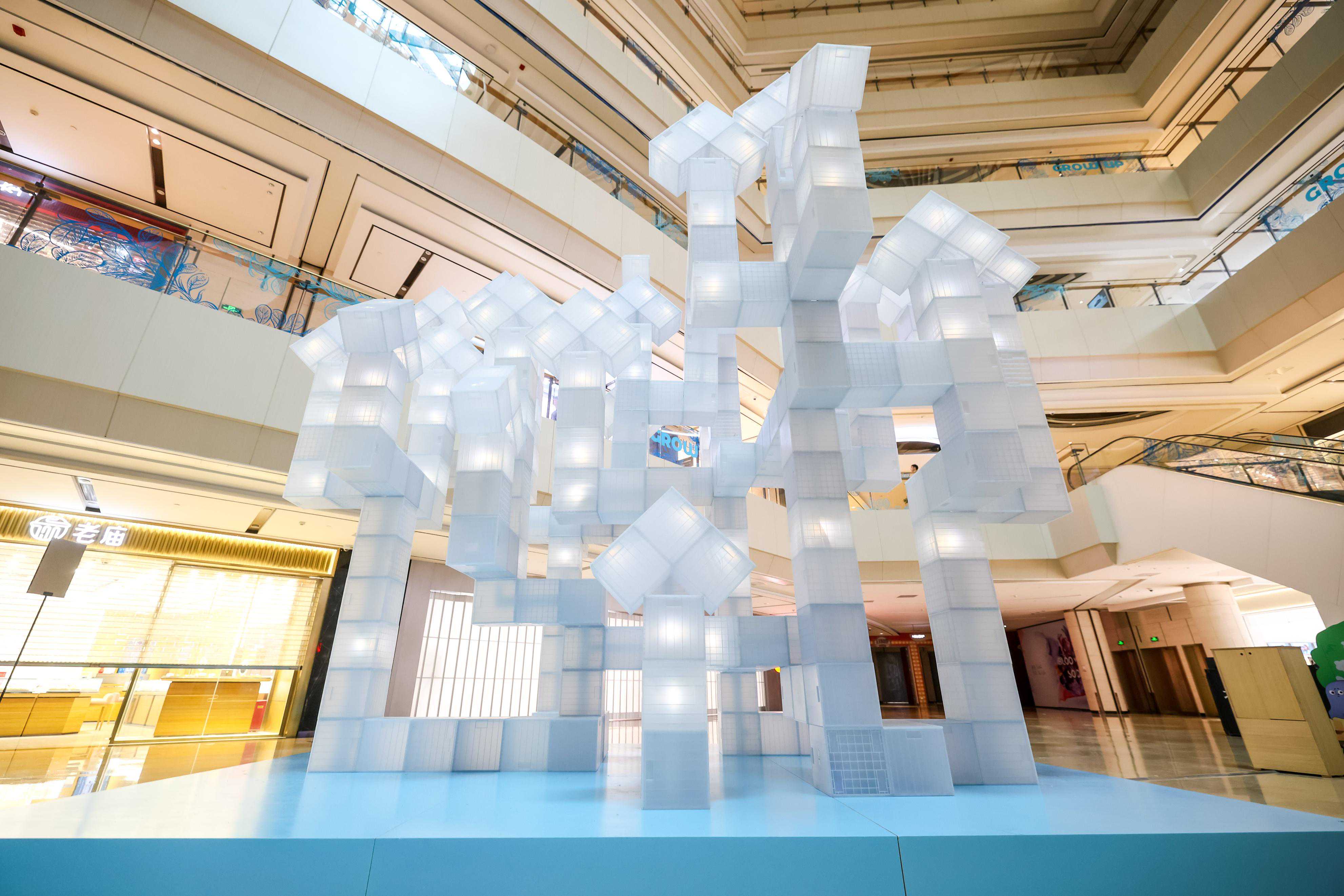 于TREE展区,此次「GrowUp申长」公共艺术展演计划的精神堡垒装置《蓝——生命之阶》耸立。这一作品同样出自于自由艺术家柴文涛的创作,象征着ROOT展区中《一粒种子》最终生长为一棵高达6米的“树”,散发着生命之光,并向着天空、向着未来不断生长。