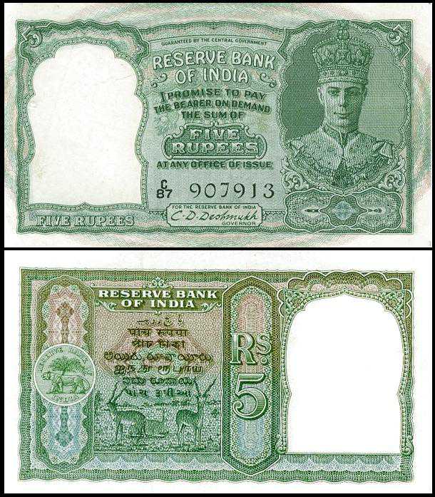 印度储备银行,1943年,5卢比,乔治六世正面像