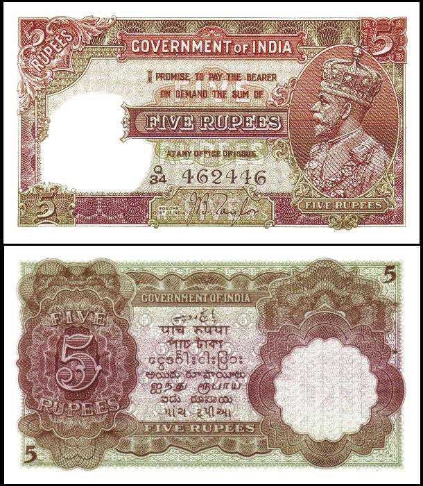 印度政府在1928年发行的5卢比,印有英王乔治五世头像