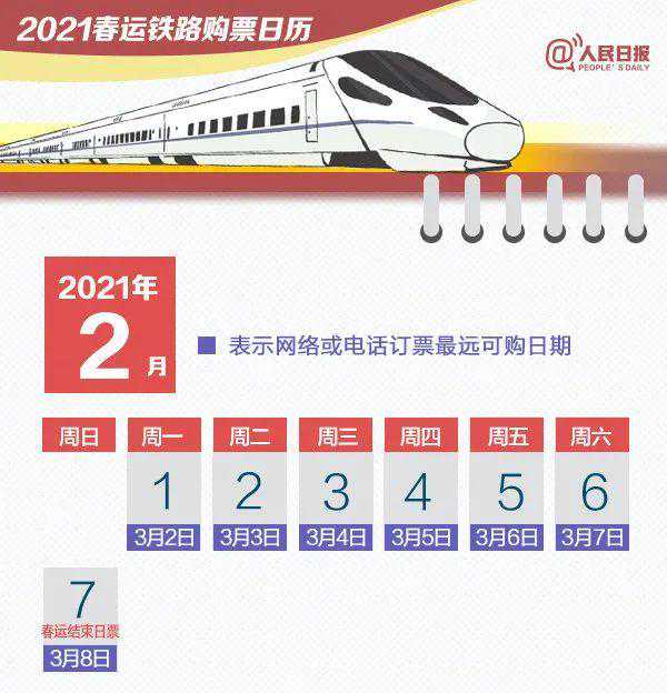 2021年铁路春运自1月28日开始,3月8日结束,共40天。按照火车票提前30天发售的安排,2020年12月30日,铁路部门开始发售2021年春运火车票。近日,铁路部门陆续推出计次票、定期票、静音车厢等服务,方便旅客出行。