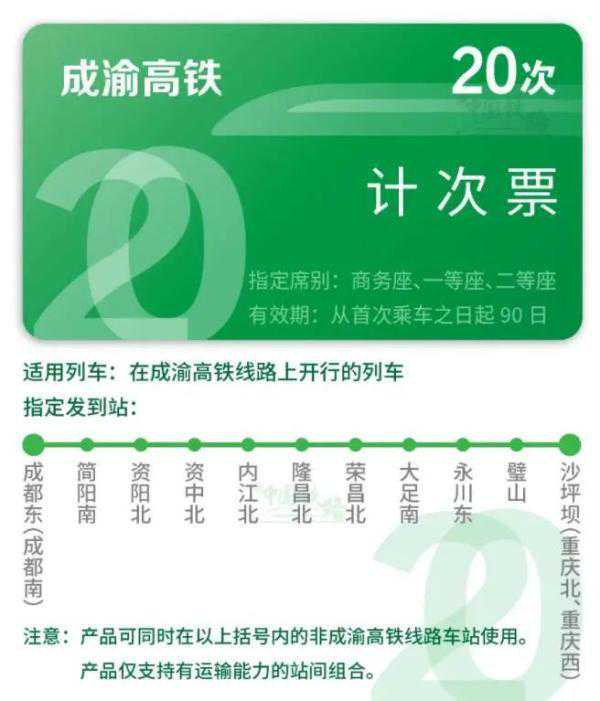 12月24日起,成渝高铁、京沪高铁试行推出计次票和定期票产品。计次票、定期票是铁路部门推出的新型票制产品,持有者可在规定的有效期内,乘坐规定次数的、购买产品时指定发到站及席别的列车。