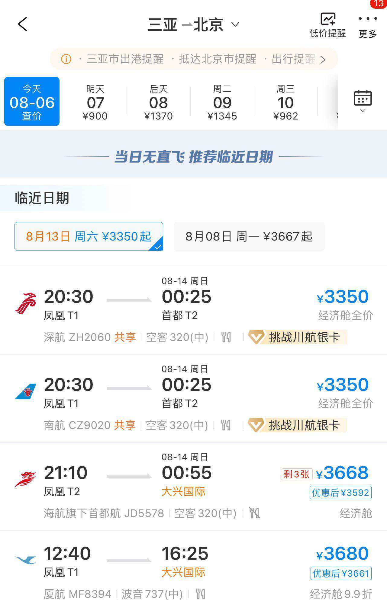 △8月6日三亚飞北京票价涨至3350元起软件截图