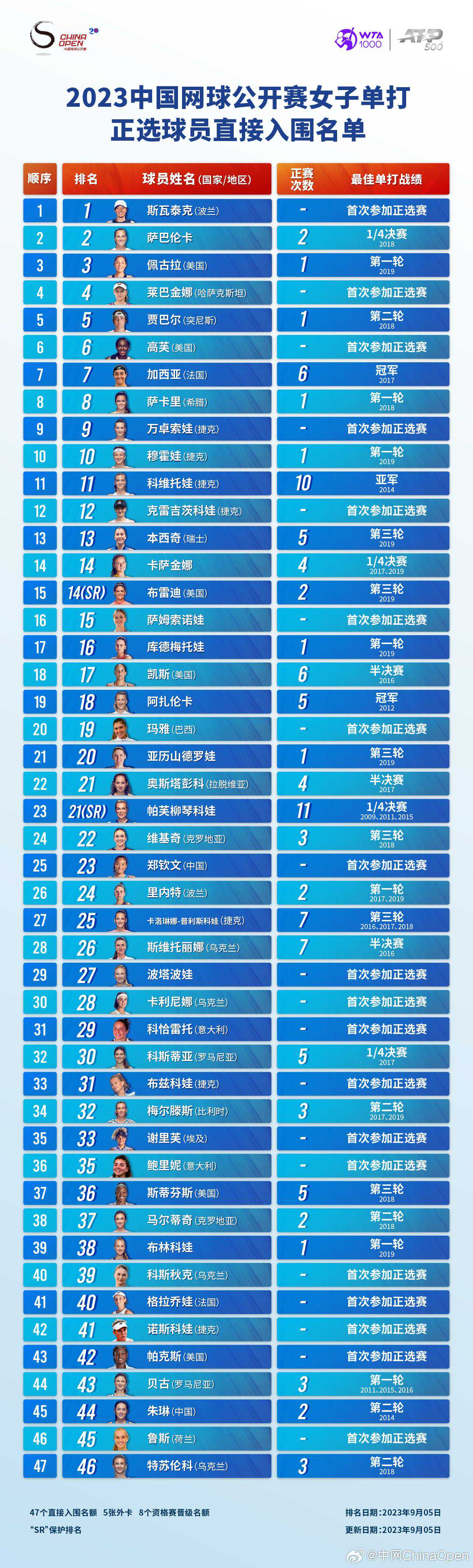 9月6日,2023年中国网球公开赛女子单打正选球员直接入围名单火热出炉。
