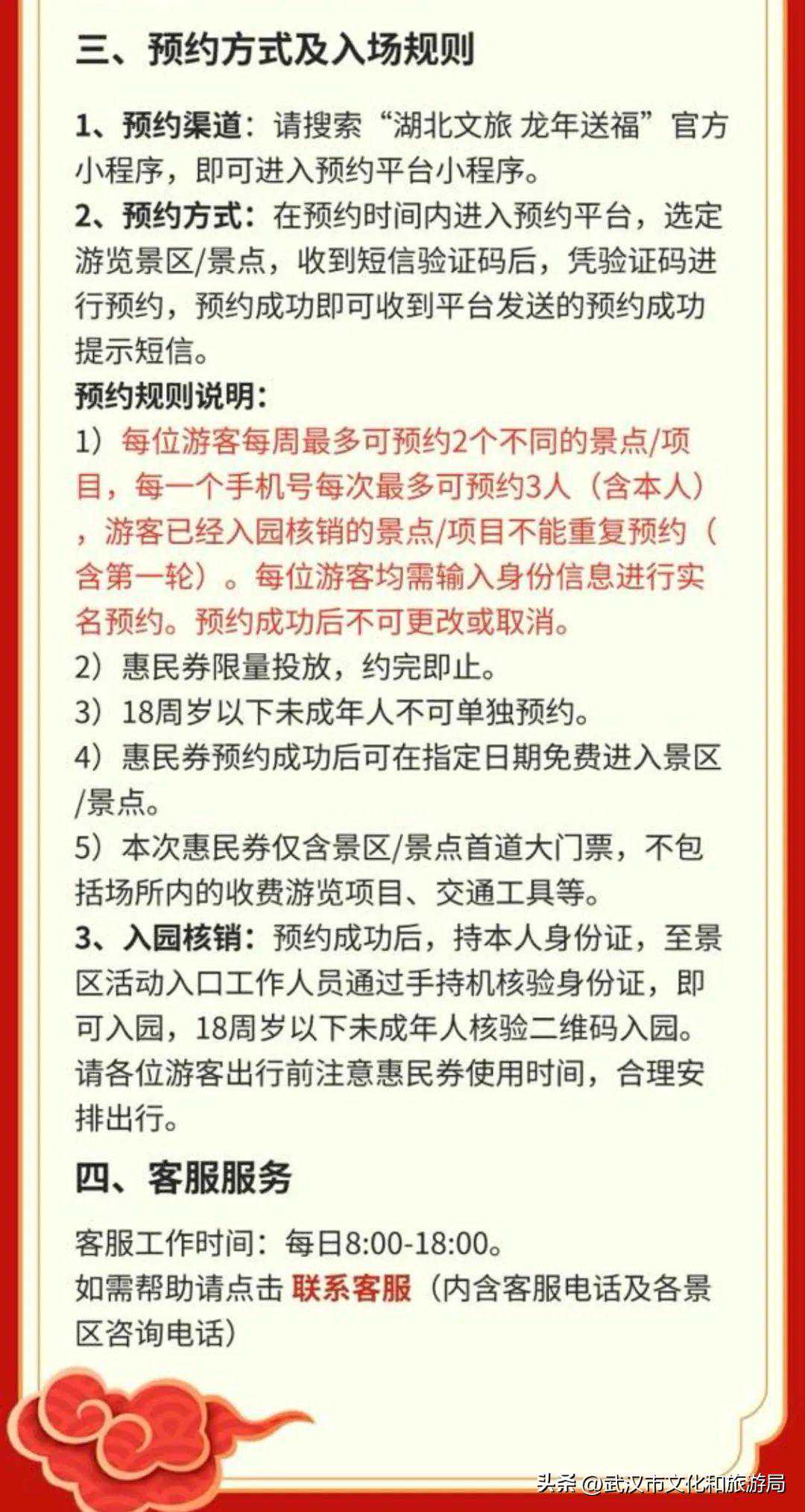 本次惠民活动将于今晚(3月11日)20:00开始,识别下方小程序二维码,或微信搜索“湖北文旅龙年送福”小程序即可预约,本地市民及全国游客都能参与。