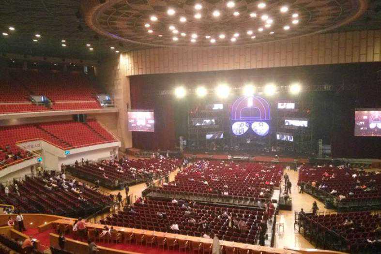 百姓大舞台分成上、下双层构造,演出舞台平面图呈橄榄形,演出舞台左右两端较大合理应用间距60米,前后左右较大深度32米,演出舞台总面积约1250平方米。大中型文艺表演可容下观众们8000-10000人上下,体育竞赛可容下观众们12000人。与此同时,可举办5000-10000人的大型活动,2000-5000人上下的中小型大会,也可举办上百人的中小型大会,是中国第一家剧场式多用途大中型房间内体育场馆。
