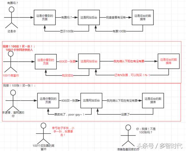 为什么说它low呢?因为票数不多但是查看余票的人太多!而且人都不傻,在没票时候还会刷新!所以来一次访问计算20次,10万人加上每个黄牛开10台电脑用来刷票,瞬间访问数达到100W,想要1秒内都得到响应需要1秒计算2000W次。