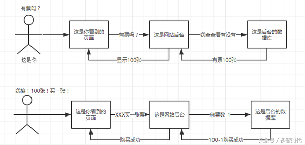一个用户想知道现在有没有票,于是打开网页,网站的后台就去查看自己的数据库,检索下有没有用户需要的数据,然后将结果展示到页面上,就形成了页面上的余票信息。