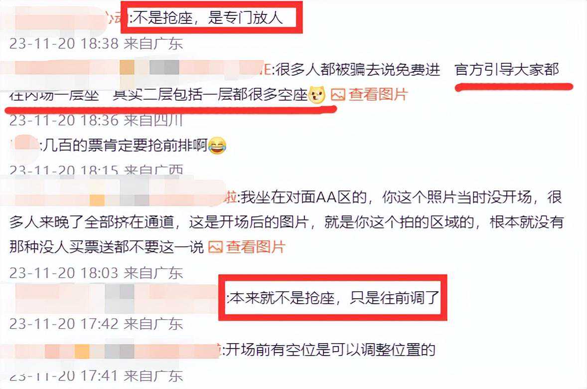 但粉丝澄清,票价打折是真的,现场也确实很混乱,但没有免费门票一事,还爆料因为前面空位很多,所以官方引导他们往前面坐,给粉丝免费升舱,不是抢座,但可能因为没有协调好,导致现场很混乱。