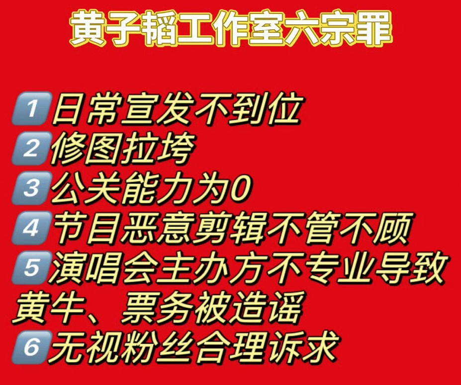 黄子韬粉丝也因此次演唱会的事情,怒斥工作室办事不力,列出了六宗罪,要求他们正视粉丝诉求,但黄子韬作为老板,在公司有绝对的话语权,演唱会的事情主办方的做法确实有问题,但黄子韬也应该好好反省,出道11年,一首大热歌曲都没有,若真的喜欢音乐,就好好去做,不要只是粉圈可见,不然这次的事情往后依旧会发生。