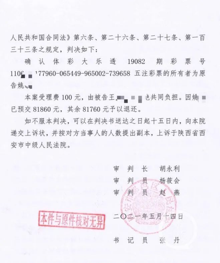和解协议撤销后,彩票纠纷案也终于可以继续审理判决,2021年5月14日,鄠邑区人民法院对彩票纠纷案作出一审判决。