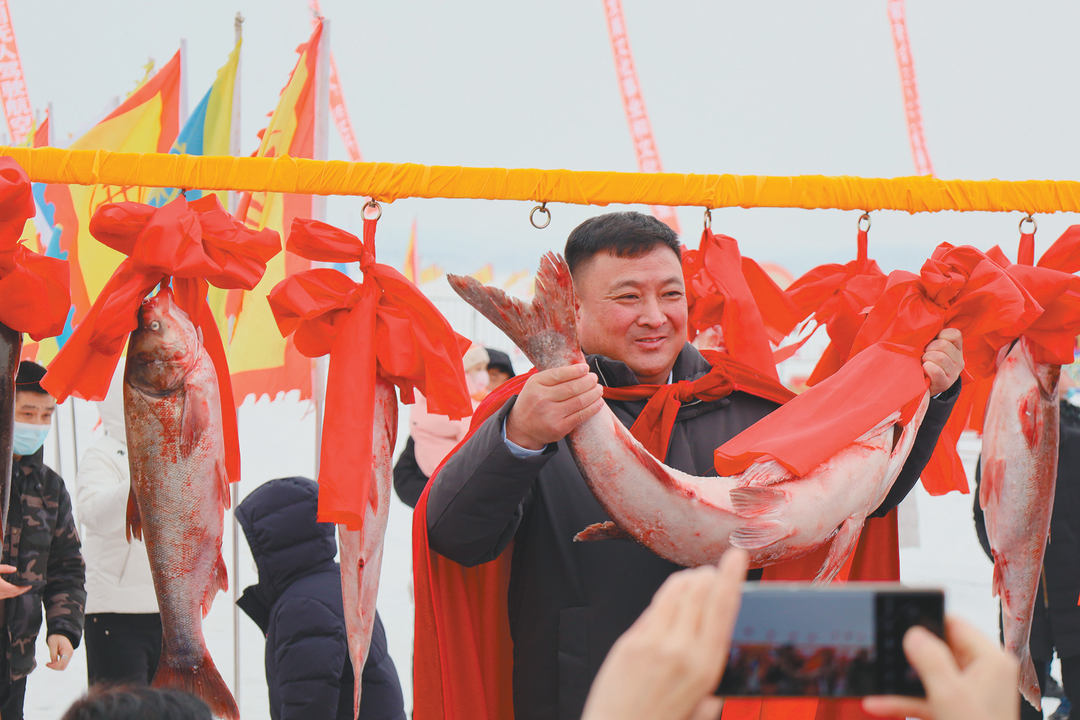 1月6日,沈阳法库财湖“大辽文化”冬捕节开幕,冰湖腾鱼的古法冬捕盛景引来不少游客。