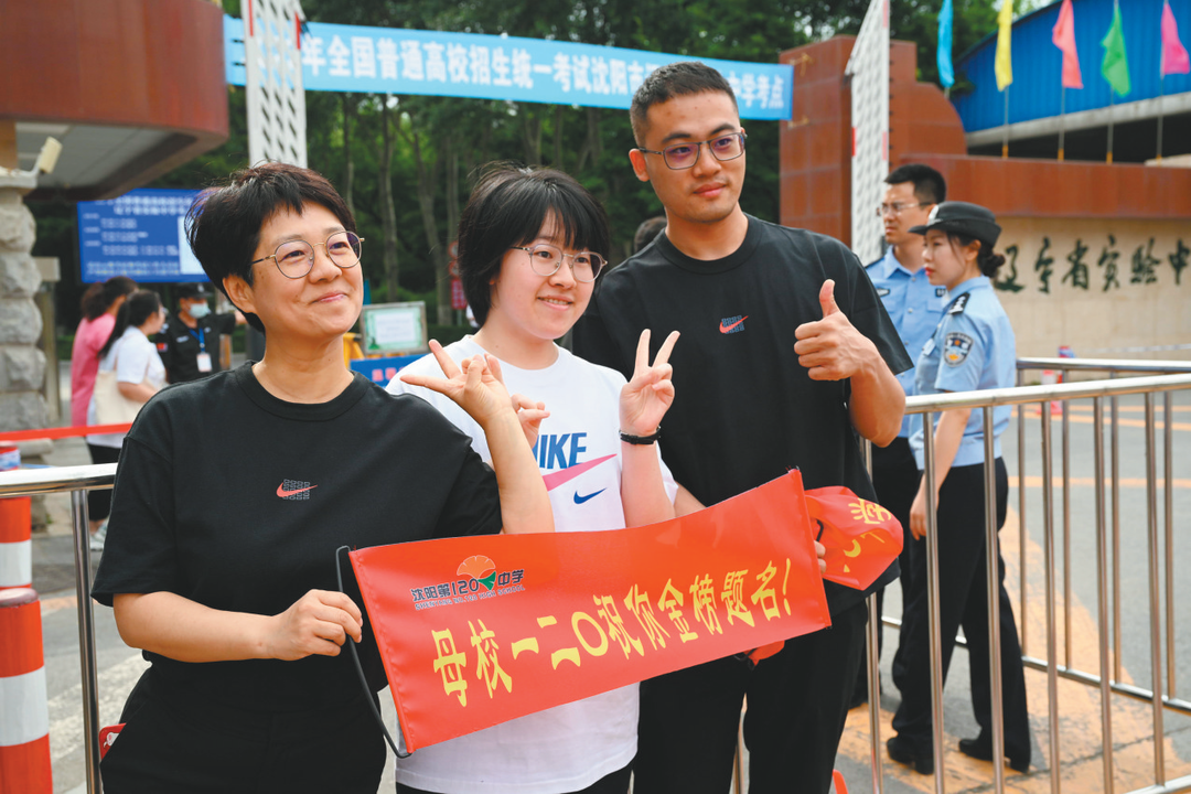 6月7日,在辽宁省实验中学考点,送考老师为高考考生送上美好祝福。