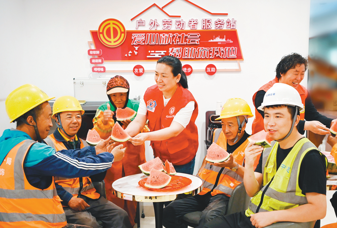6月14日,几名建筑工、环卫工和快递小哥正在沈阳市沈河区建院社区户外劳动者服务站里享受清凉。