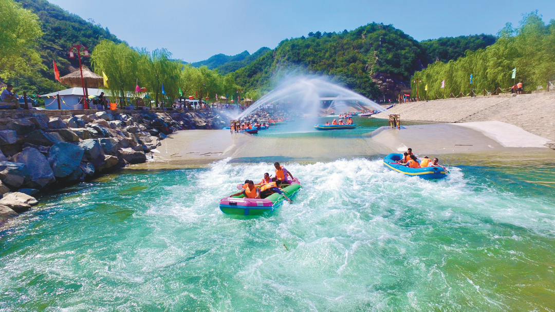 8月2日,在绥中县永安堡乡的永安峡谷漂流景区,游客在体验水上漂流。
