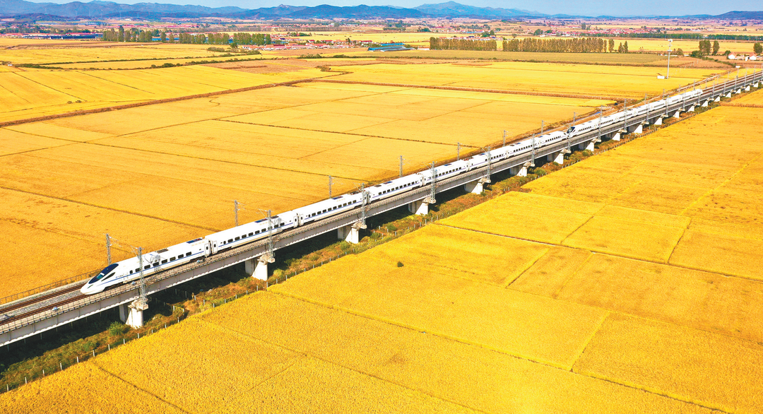 10月14日,一列高铁在大连庄河市一片金色的稻田间行驶,为千重稻浪增添了一份灵动。