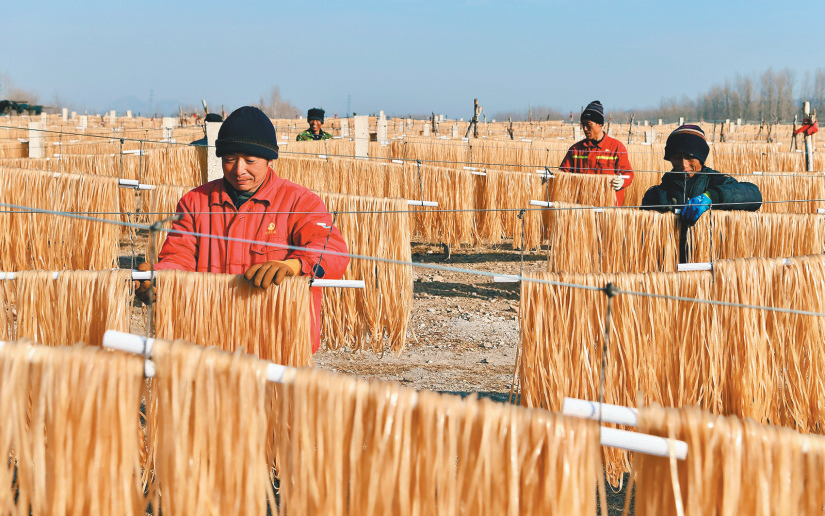 12月5日,在朝阳市朝阳县六家子镇官粮窖村六合粉条专业合作社的晾晒场上,社员正忙着晾晒粉条。
