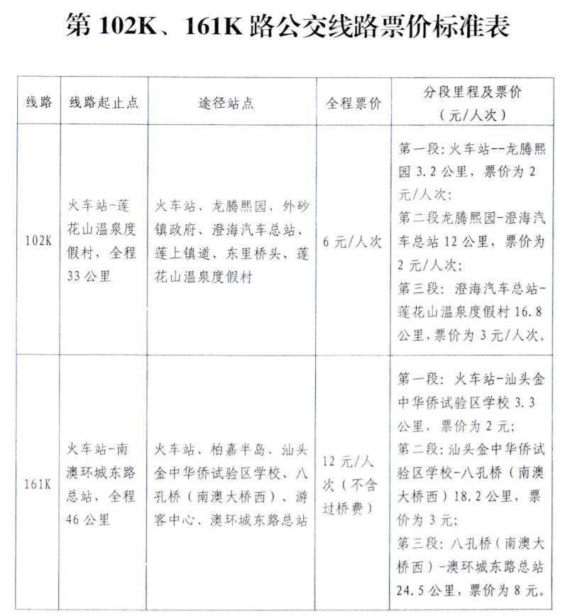 汕头市发展和改革局发布《关于第102K、161K路公交线路票价问题的复函》。复函明确,第102K路公交线路全程票价为6元/人次,第161K路公交线路全程票价为12元/人次,实行分段票价。