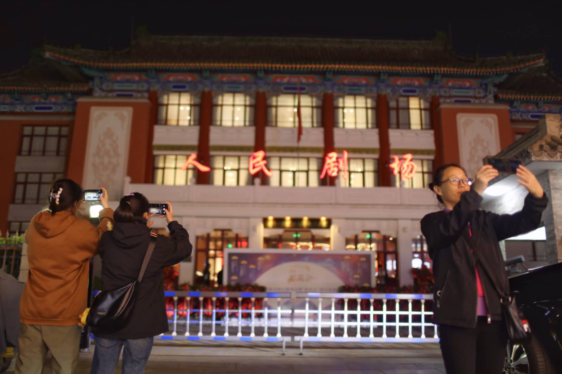10月16日晚,戏迷在重张的人民剧场门口留影。新京报记者浦峰摄