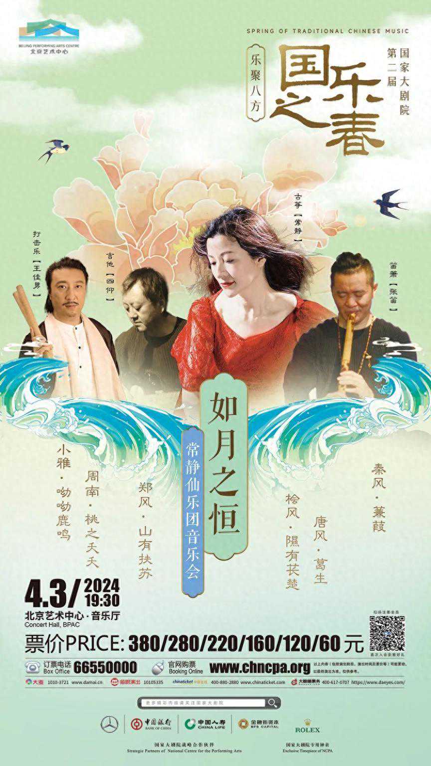 常静仙乐团将登台北京艺术中心音乐厅,带着对各地地缘文化的探索和理解,对文明本源的笃定和潜行,带来一场充满希望的新作“如月之恒”音乐会。常静仙乐团将表演融入了戏曲、诗词等中国音乐元素,并开创了古筝弹唱的先河。本场音乐会中,艺术家们将向遥远的过去飞驰,回到两千五百年前诗经的旷野、十五国之疆域,怀着对东方诗性源头的敬意,在铿锵稳健、婉转美妙的律动中,连接先人的心跳。