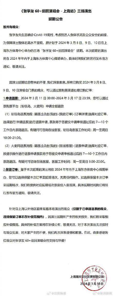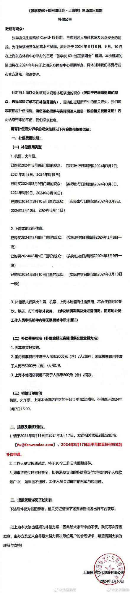 3月10日晚,主办方@CMCLive华人文化演艺发布延期公告及补偿公告,称本次延期的演出将在2024年年内于上海东方体育中心择期举办。对于已申请退票、来自上海以外地区的观众,补偿车票、机票、住宿等相关损失。