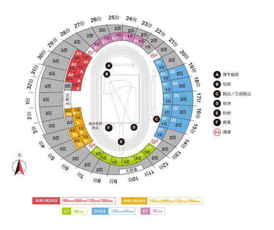 比赛门票根据颜色不同,分别对应不同观赛区域。上海体育场看台座位分为ABCDE五个区域,每个区域对应的观赛位置如下图所示。