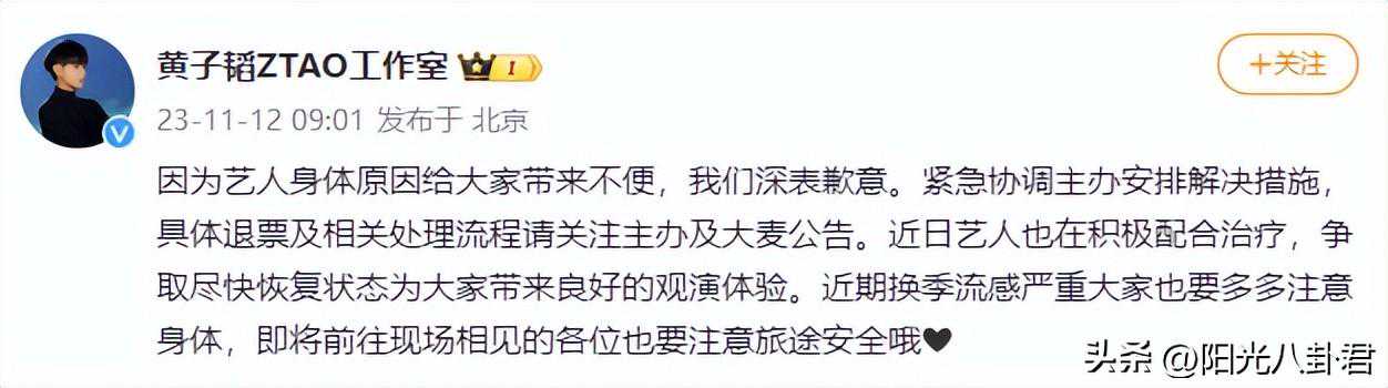 说到这里,前几天黄子韬方突然临时发公告取消了两场演唱会的其中一场一事,引起了很多网友的质疑。