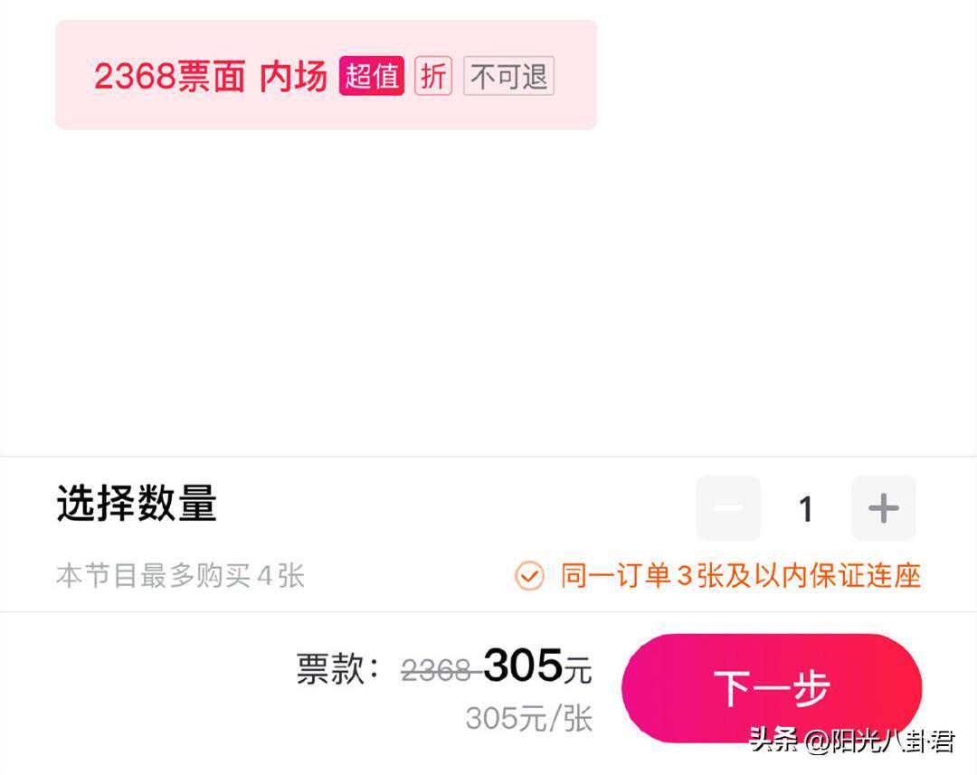 按照最便宜的门票368元的原价来算,折完是47.84元,即使按照最贵的内场门票2368元的原价来算,折完也仅仅只需307.84元,这几乎相当于白送了吧?