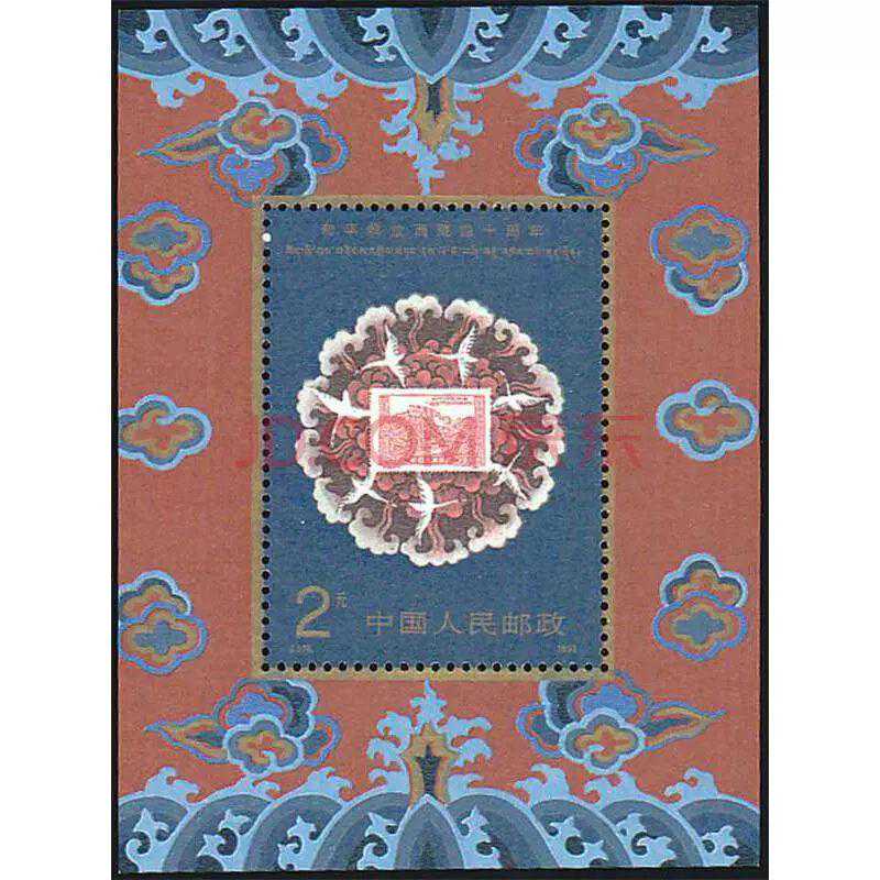 (6)1996-4M《中国邮政开办一百周年》小型张1枚,票中票是清代红印花加盖改值8枚邮票,其中红印花加盖小字“当壹圆”邮票是清代珍邮中最名贵的邮品,存世量极少。