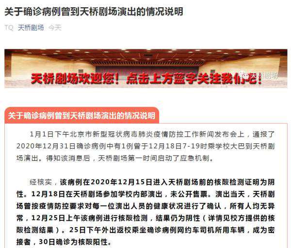 经核实,该病例在2020年12月15日进入天桥剧场前的核酸检测证明为阴性。12月18日在天桥剧场参加学校内部演出,未公开售票。演出当天,天桥剧场曾按疫情防控要求对每一位演出人员的健康状况进行了确认,所有人均无异常,12月25日上午该病例进行核酸检测,结果仍为阴性。25日下午外出返校乘坐确诊病例网约车司机所用车辆,成为密接者,30日确诊为核酸阳性。